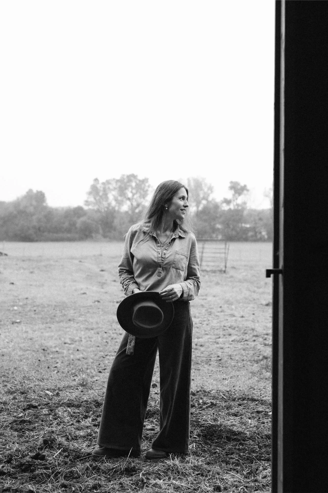 Black and white portrait of woman holding hat