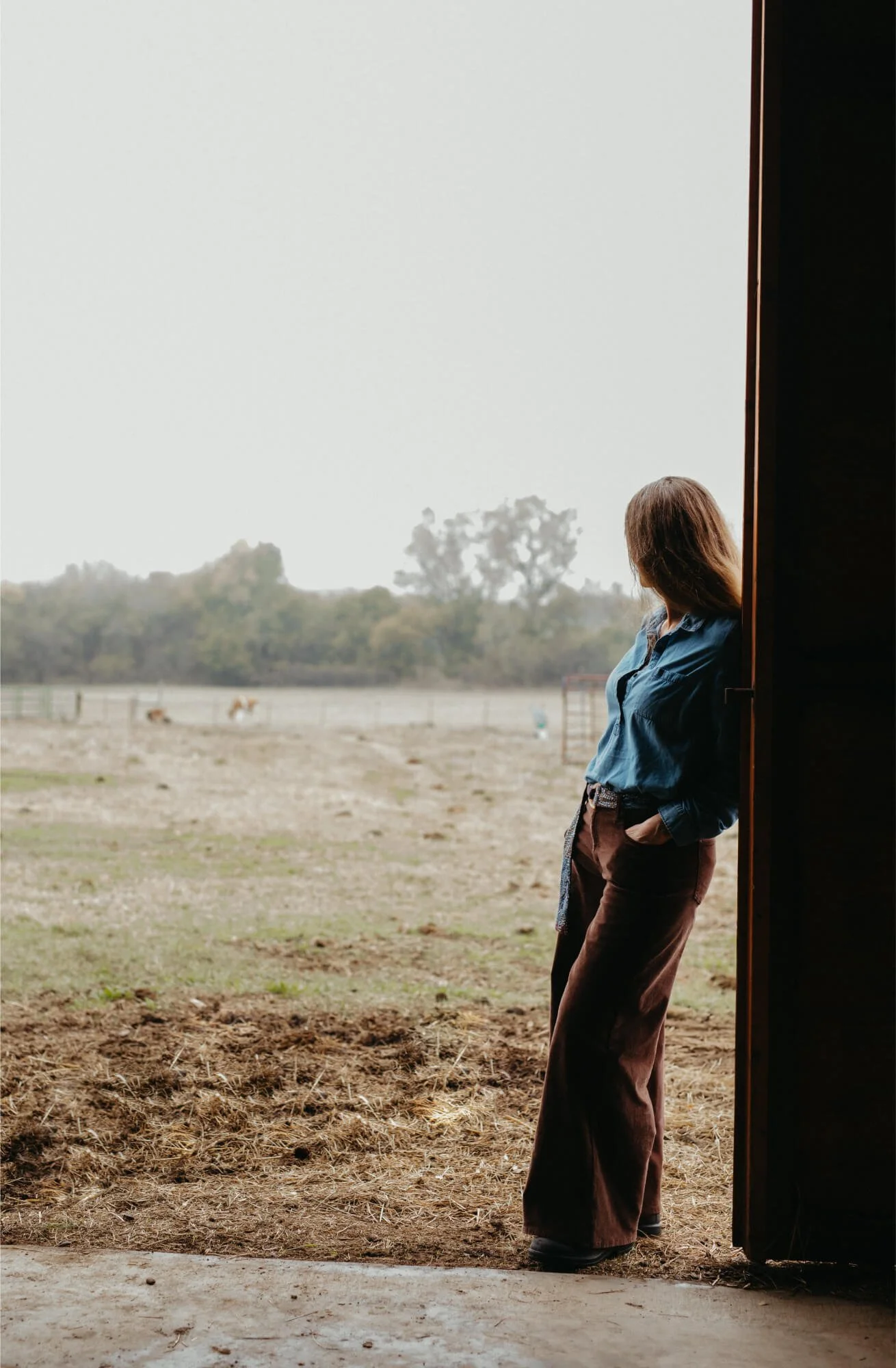 Woman leans against door frame