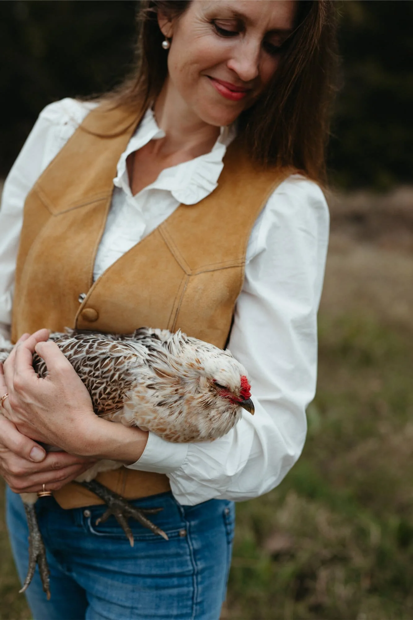 Woman in vest holding chicken View fullsize