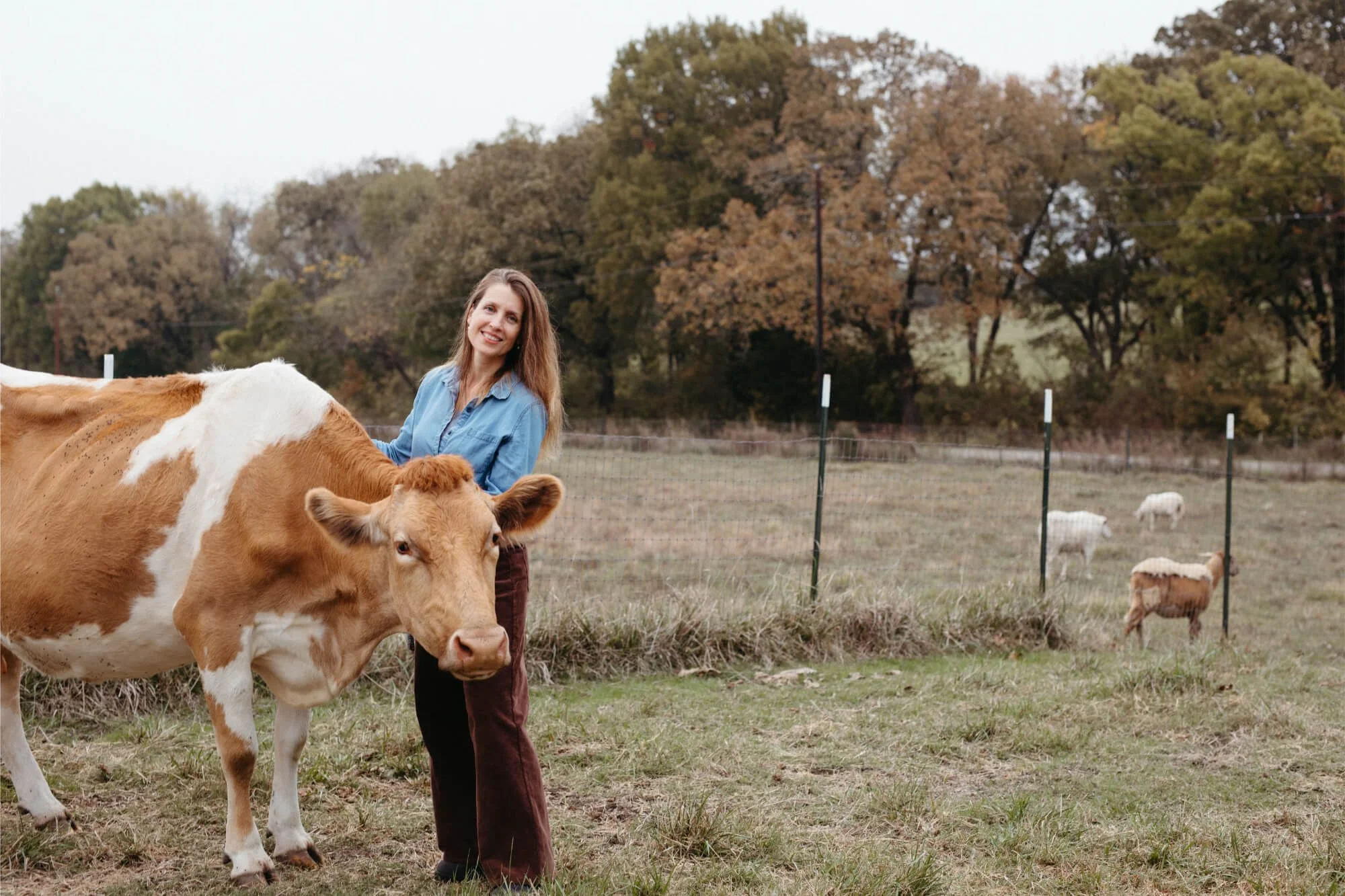 Woman and cow in Dallas field