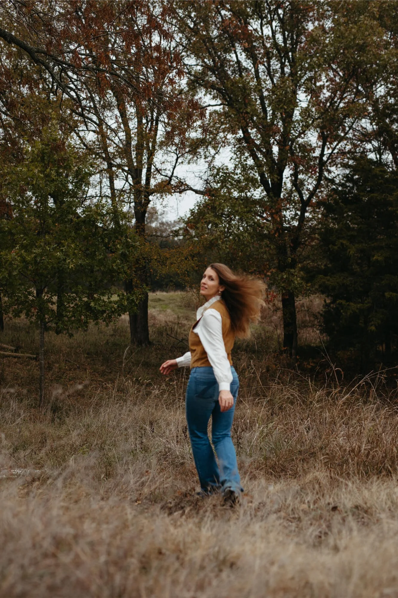 Woman runs toward trees