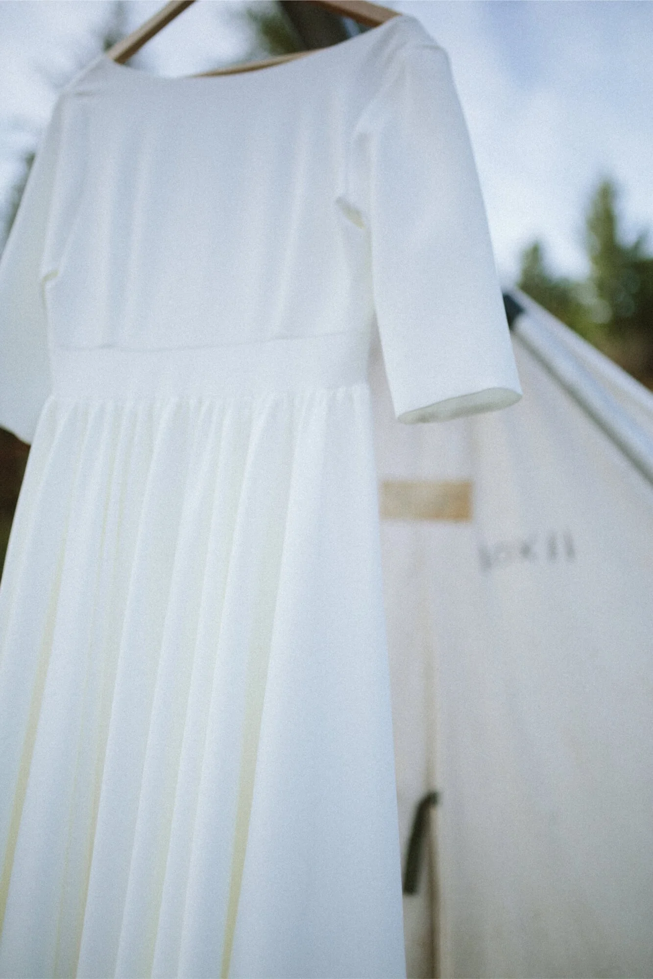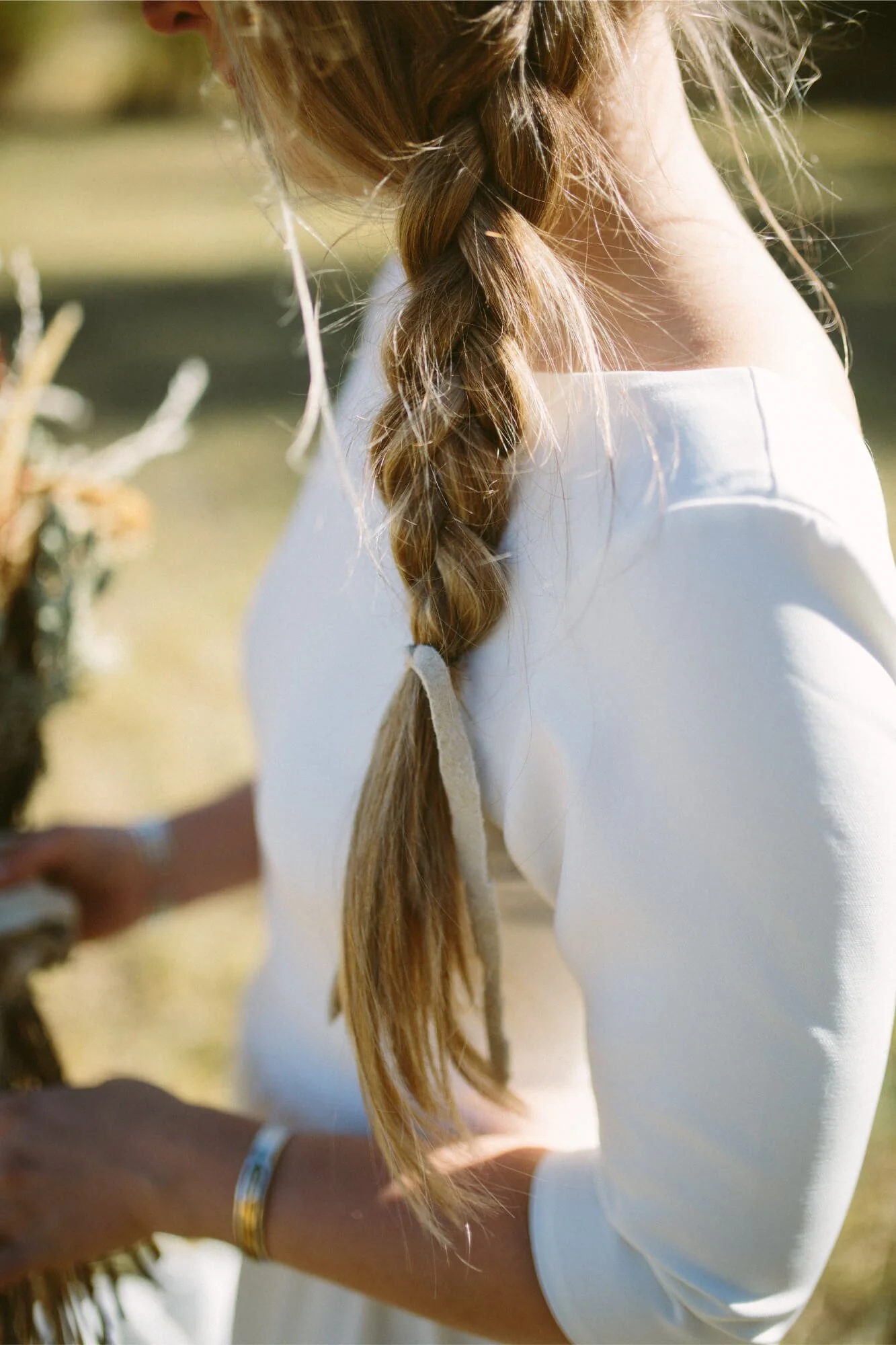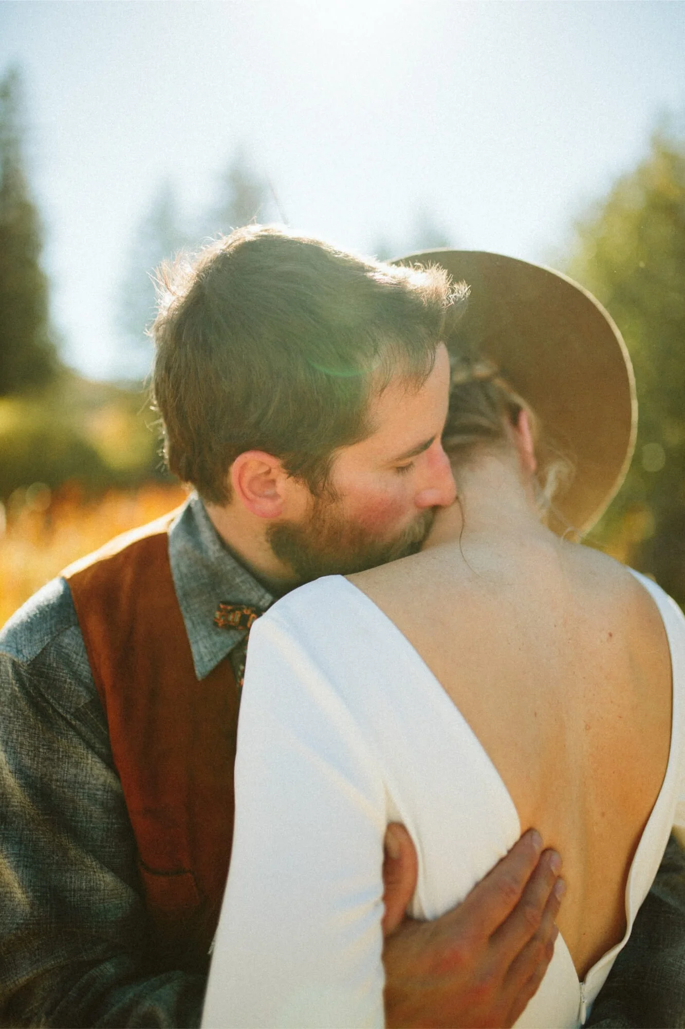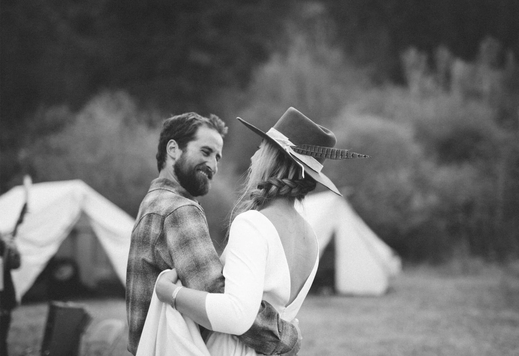 Guests got ready in canvas cowboy tents before gathering around a long table for a beautiful meal by Horsewood Catering, featuring elk harvested by the couple themselves. As the sun dipped low, a bluegrass band played into the night, with plenty of whiskey and laughter, and a whole lot of dancing under the stars with only a campfire to light the scene. It was a day stitched together with grit, beauty, and deep, deep love—a perfect reflection of Ricky and Alex.