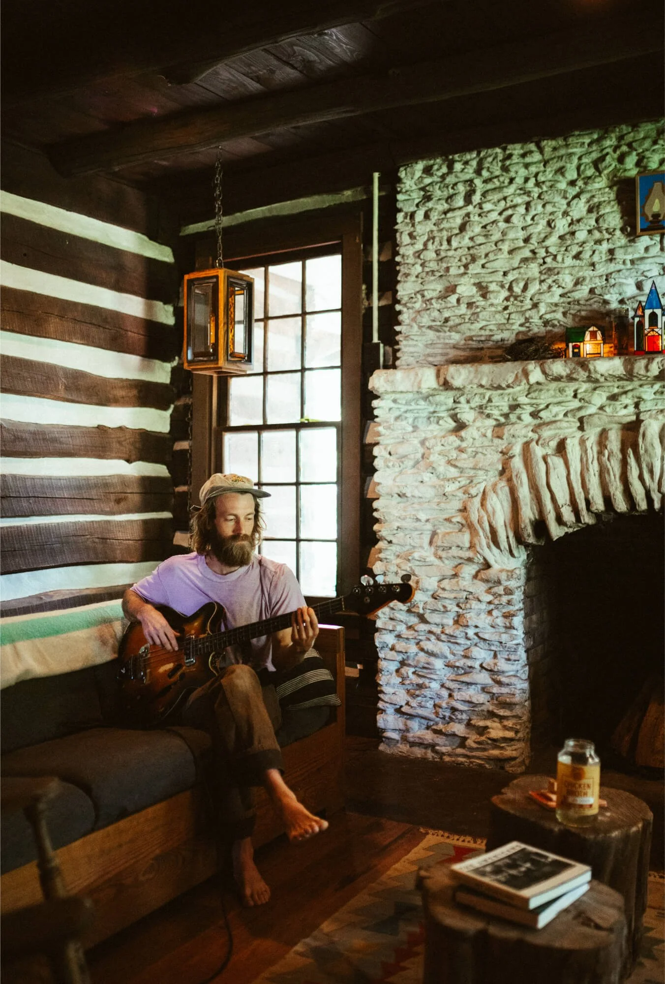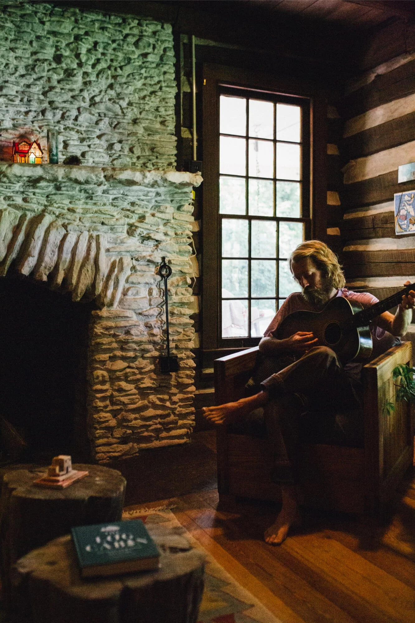 Man playing guitar beside cobblestone fireplace