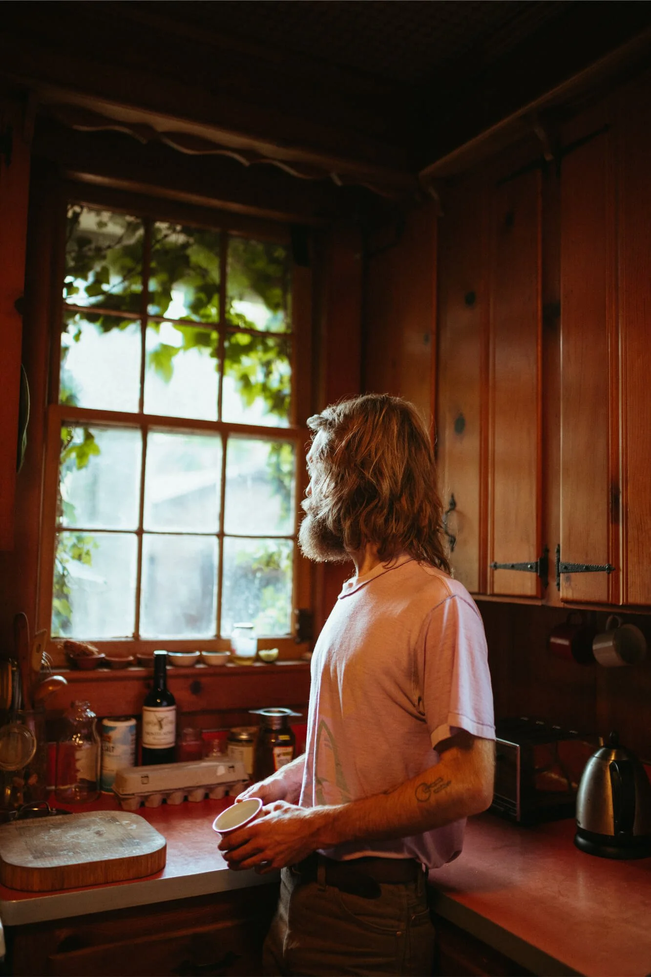 Man in kitchen looks out window