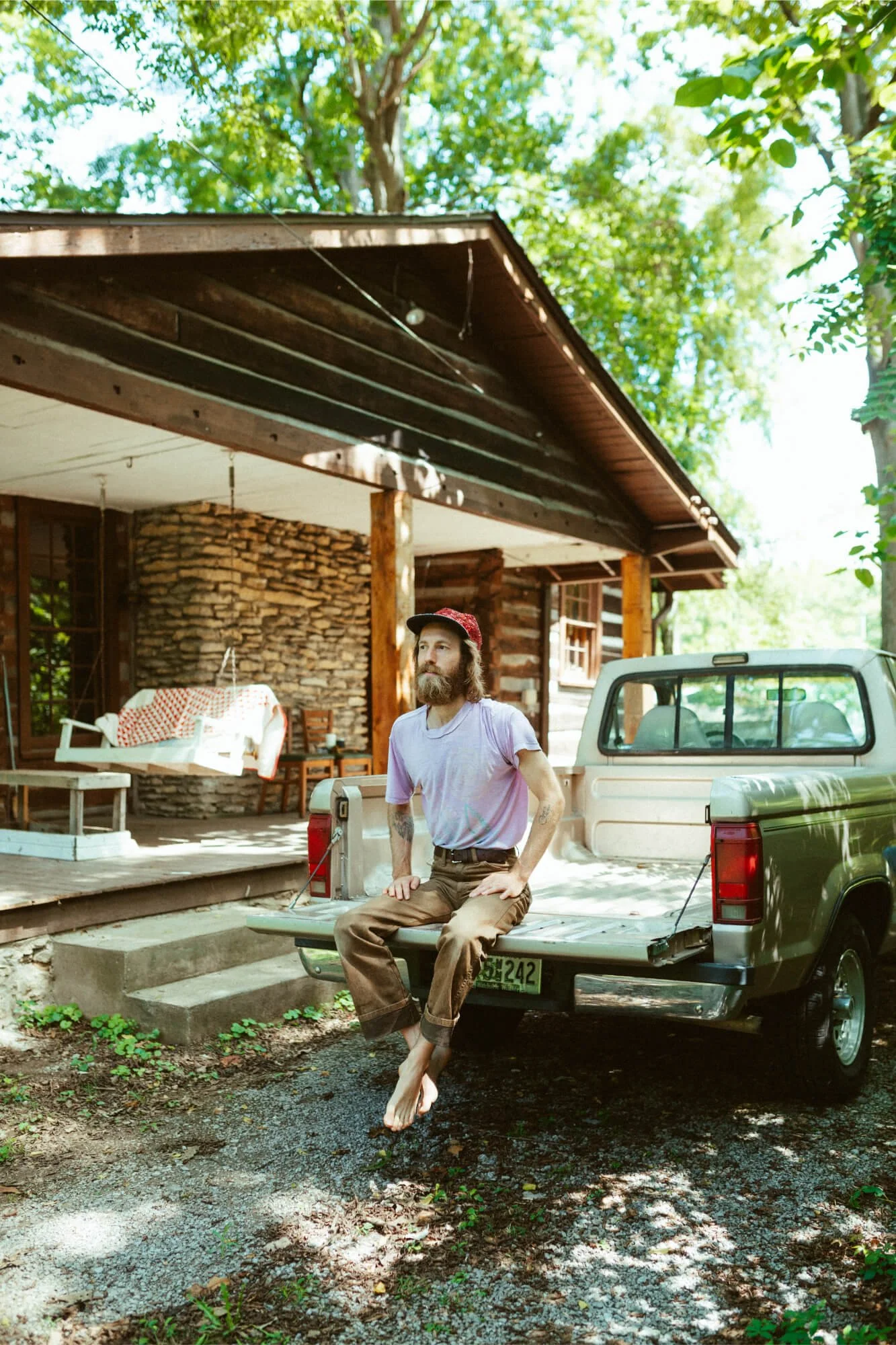 Man sits on truck bed by log cabin