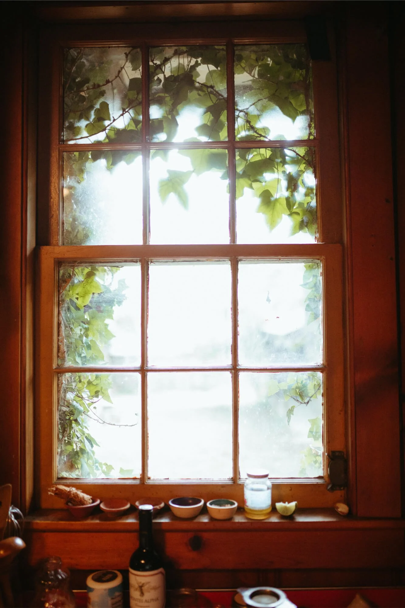 Kitchen window with leaves outside