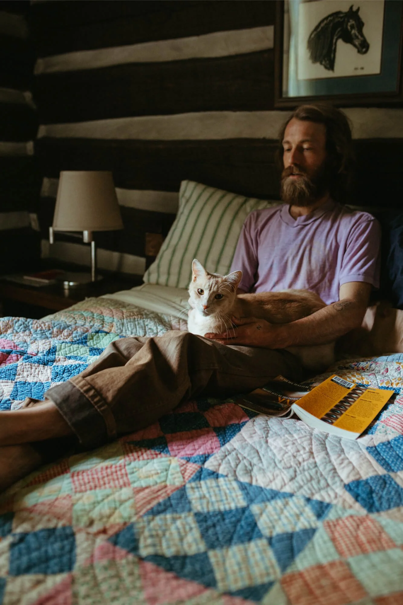 Man and cat sit on bed with quilt